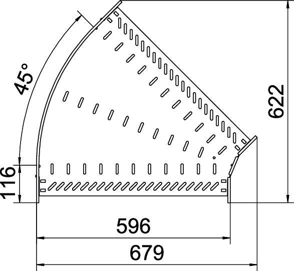 45°-Bogen zum Erstellen einer horizontalen Abzweigung, Formteil für rast- und schraubbare Kabelrinnen Seitenhöhe 85 mm. Schraubenlose Montage mit Doppelklemmen oder Schraubverbindung mit Flachrundschrauben FRS und Kombimuttern M6. Einsetzbar im Innenbereich. Befestigungsmaterial muss separat bestellt werden.