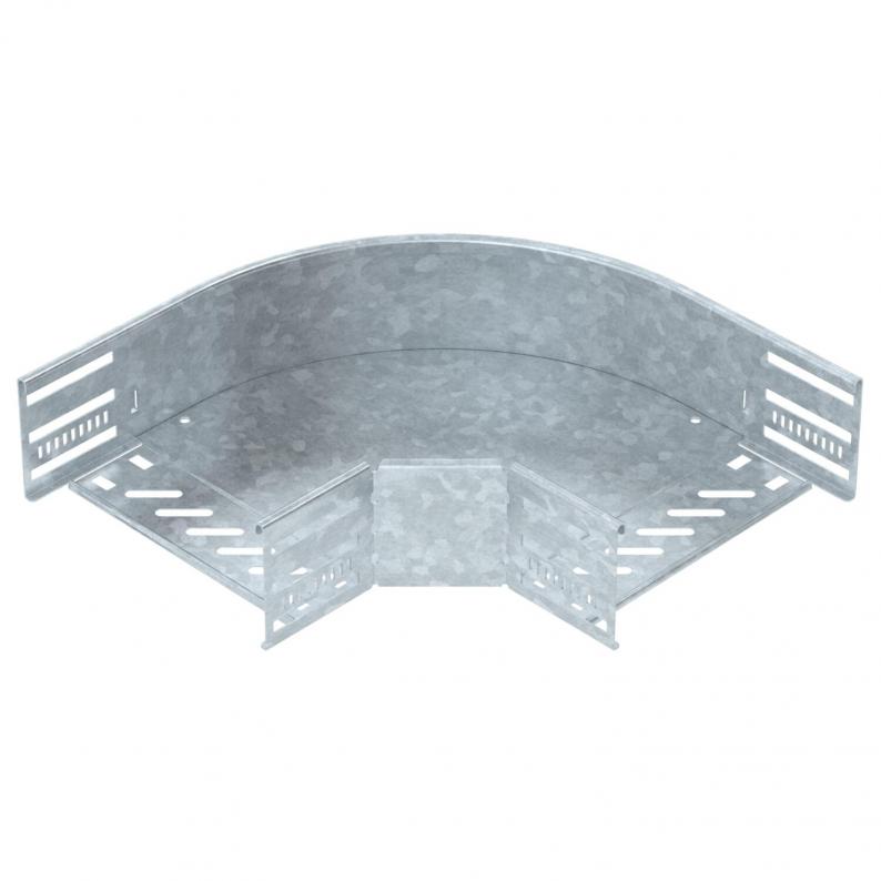 90°-Bogen zum Erstellen einer horizontalen Abzweigung, Formteil für rast- und schraubbare Kabelrinnen Seitenhöhe 85 mm. Schraubenlose Montage mit Doppelklemmen oder Schraubverbindung mit Flachrundschrauben FRS und Kombimuttern M6. Einsetzbar im Innen- und Außenbereich. Befestigungsmaterial muss separat bestellt werden.