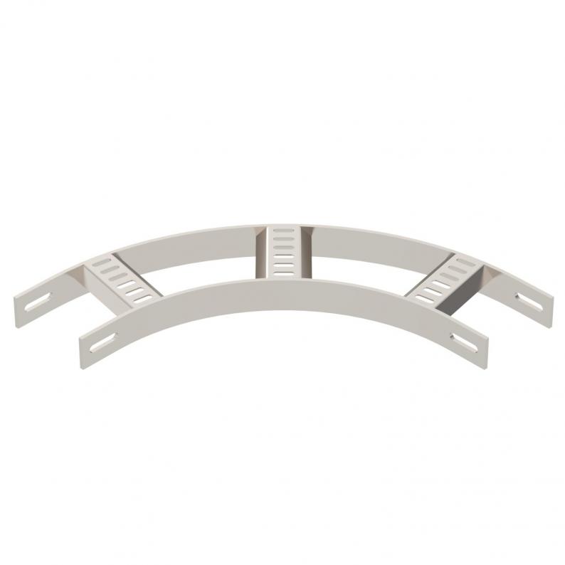 90° Bogen für Schiffsbau-Kabelleiter Typ SL 62 mit der Seitenhöhe 40 mm, mit eingeschweißten, nach unten offenen und gelochten Trapezsprossen.