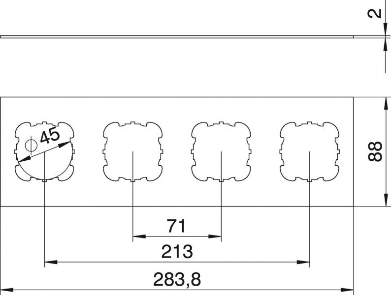 Abdeckplatte mit 4 Lochungen (Ø 45 mm) für 4 Installationsgeräte mit Tragering oder -bügel, passend zur T12L-Längsseite (1/1-Abdeckung).