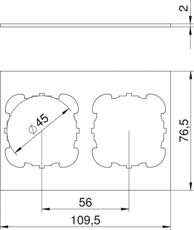 Abdeckplatte mit 2 Lochungen (Ø 45 mm) für 2 Installationsgeräte mit Tragebügel (EK-Version), passend zur T4B-Längsseite (1/1-Abdeckung).