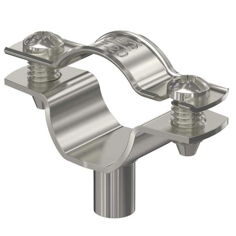 Abstandschelle zur Montage von Rohren und Kabeln an Wand, Decke und Boden. Mit selbstsicherndem Oberteil. Befestigung über Ansatz mit Innengewinde. Zugelassen für den Funktionserhalt nach DIN 4102 Teil 12, Funktionserhaltklassen E 30 bis E 90.