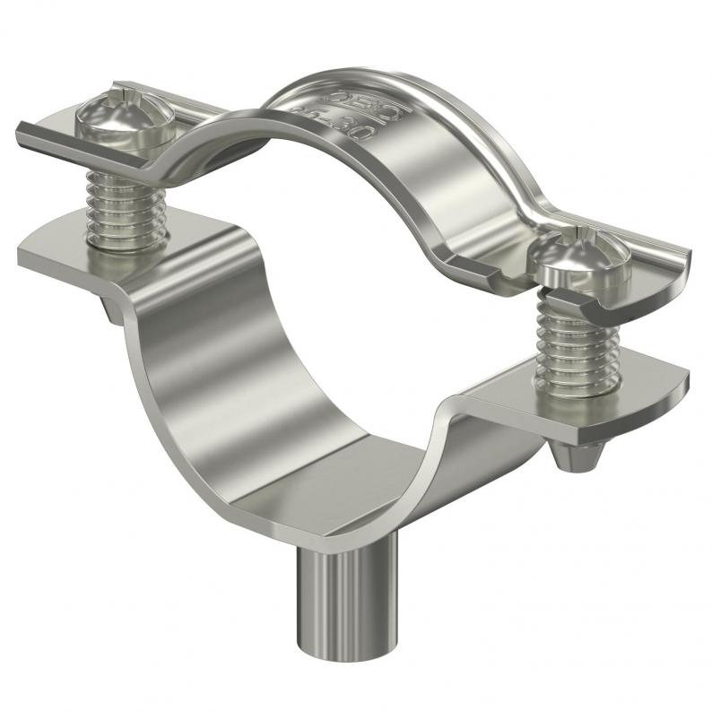 Abstandschelle zur Montage von Rohren und Kabeln an Wand, Decke und Boden. Mit selbstsicherndem Oberteil. Befestigung über Ansatz mit Innengewinde. Zugelassen für den Funktionserhalt nach DIN 4102 Teil 12, Funktionserhaltklassen E 30 bis E 90.