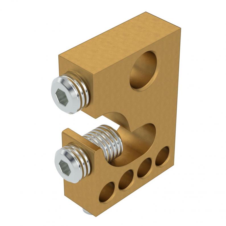 Zweifache Anschlussklemme zur Aufnahme von 2 Leiterseilen, zum Erstellen des Schutzpotentialausgleichs bei Kabeltragsystemen. Zur Direktmontage an Kabeltragsystemen mit Schraube M8 geeignet. Leiterseil bis max. 120 mm², 4 Erdungskabelanschlüsse mit max. 35 mm² nach DIN 46228 Teil 4, Abisolierlänge 18 mm.