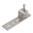 Befestigungsklemmstück zur Montage von leichten Bauteilen an waagerechten Stahlträgern. Geeignet z. B. für Gitterrinnen und Kabelrinnen bis 300 mm Breite oder Schellen. Der Verlauf des am Befestigungsklemmstück angebrachten Kabeltragsystems ist waagerecht.