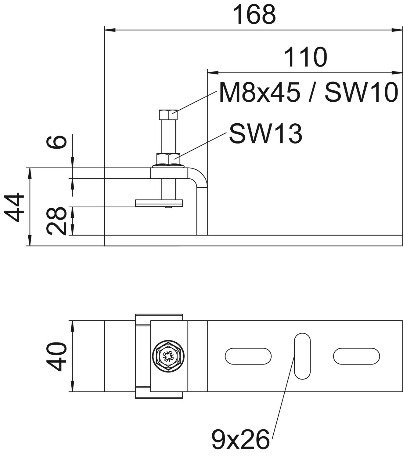 Befestigungsklemmstück zur Montage von leichten Bauteilen an waagerechten Stahlträgern. Geeignet z. B. für Gitterrinnen und Kabelrinnen bis 300 mm Breite oder Schellen. Der Verlauf des am Befestigungsklemmstück angebrachten Kabeltragsystems ist waagerecht.