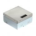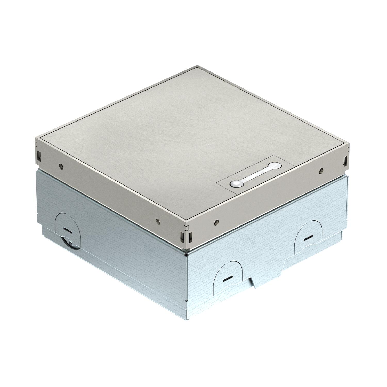 Quadratische Bodensteckdose für den Einsatz in trocken gepflegten System- und Estrichböden im Innenbereich. Einbaugehäuse mit vorgeprägten Einführungsöffnungen für Rohre (M20/M25). Oberteil durch 4 Nivellierstützen auf Oberkante Bodenbelag einstellbar. Die Mindesteinbautiefe beträgt 75 mm, der Nivellierbereich + 30 mm. Im Bodenbelag sichtbarer Rahmen und Deckel aus Edelstahl. Deckel mit Dekorplatte und Bürstenauslass zur Leitungsführung. Leergehäuse für ein Modul 45®-Installationsgerät und eine Datenbuchse. Im Auslieferungszustand mit einer Blindplatte verschlossen.