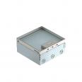 Quadratischer Bodentank für den Einsatz in trocken gepflegten Hohlböden und Estrichböden im Innenbereich. Einbaugehäuse mit vorgeprägten Einführungsöffnungen für Rohre (M25). Leergehäuse für bis zu 2 Universalträger UT3 für bis zu 6 Modul 45 ® -Einbaugeräte. Oberteil durch 4 Nivellierstützen auf Oberkante Bodenbelag einstellbar. Die Mindesteinbautiefe beträgt 95 mm, der Nivellierbereich + 30 mm.