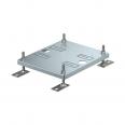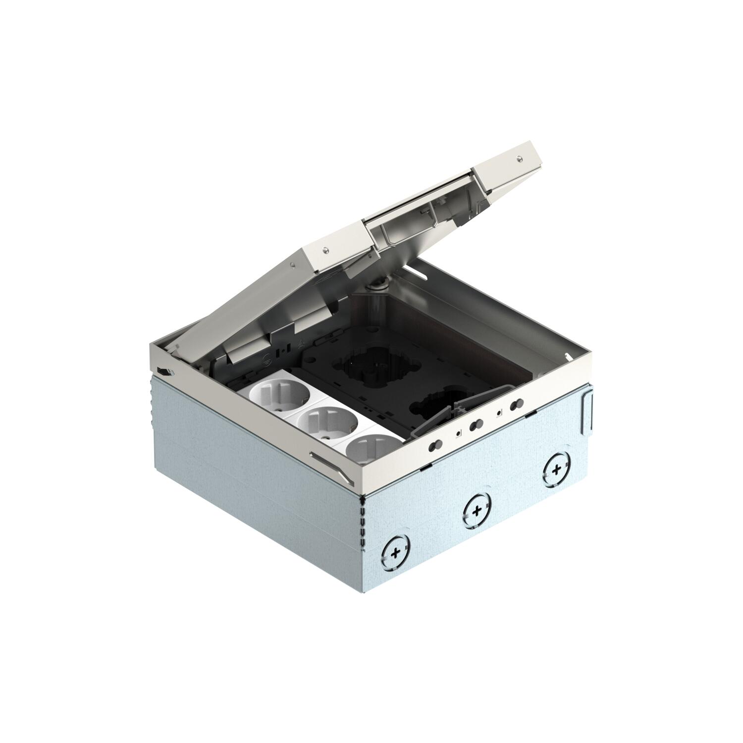 Quadratischer Bodentank für den Einsatz in trocken gepflegten Hohlböden und Estrichböden im Innenbereich. Einbaugehäuse mit vorgeprägten Einführungsöffnungen für Rohre (M25). Mit 2 Universalträgern UT3 und einer 3-fach Steckdose. Oberteil durch 4 Nivellierstützen auf Oberkante Bodenbelag einstellbar. Die Mindesteinbautiefe beträgt 95 mm, der Nivellierbereich + 30 mm.