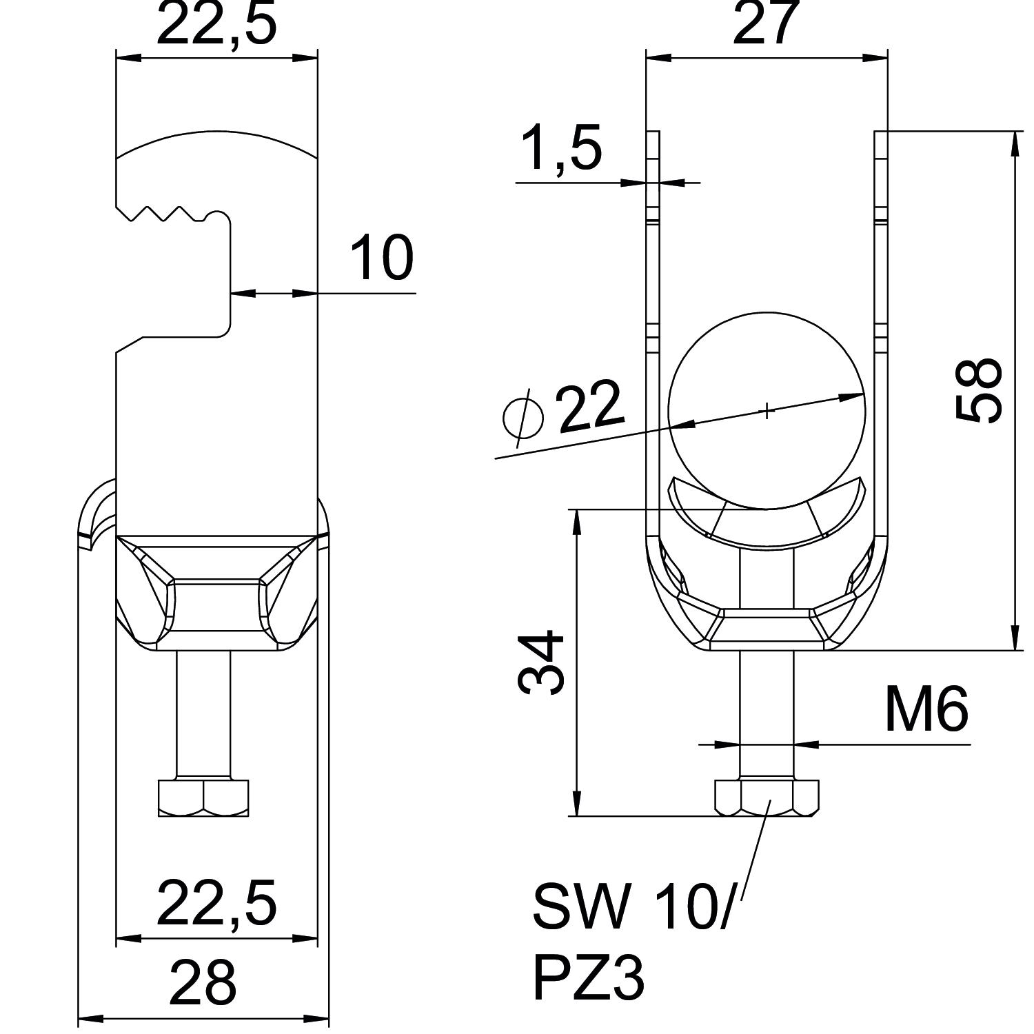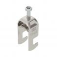 Bügelschelle mit F-Fuß, Metalldruckwanne mit gerundeten Kanten für Kabelschutz. Zur vertikalen und horizontalen Montage von 1 Einzelkabel an Flacheisen. Mit 1-gängiger Schraube an Druckwanne, universeller Sechskant-Schraubenkopf SW10, mit Schlitz und Kreuzschlitz. Geeignet für Montage im Innen-und Außenbereich. Der Einsatz einer Gegenwanne wird empfohlen.