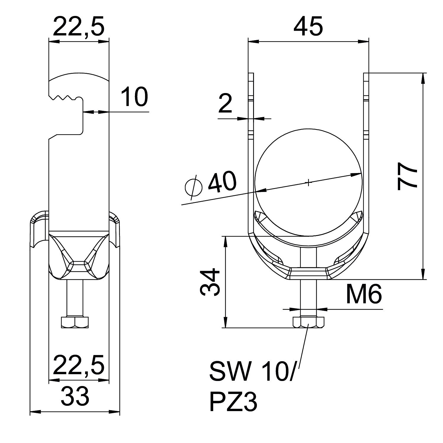 Bügelschelle mit F-Fuß, Metalldruckwanne mit gerundeten Kanten für Kabelschutz. Zur vertikalen und horizontalen Montage von 1 Einzelkabel an Flacheisen. Mit 1-gängiger Schraube an Druckwanne, universeller Sechskant-Schraubenkopf SW10, mit Schlitz und Kreuzschlitz. Geeignet für Montage im Innen-und Außenbereich. Der Einsatz einer Gegenwanne wird empfohlen.
