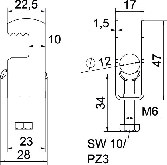 Bügelschelle mit F-Fuß, Metalldruckwanne mit gerundeten Kanten für Kabelschutz. Zur vertikalen und horizontalen Montage von 1 Einzelkabel an Flacheisen. Mit 1-gängiger Schraube an Druckwanne, universeller Sechskant-Schraubenkopf SW10, mit Schlitz und Kreuzschlitz. Geeignet für Montage im Innen-und Außenbereich. Der Einsatz einer Gegenwanne wird empfohlen.