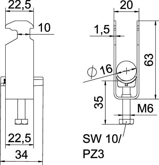 Bügelschelle mit Hammerkopf-Fuß, Kunststoffdruckwanne aus Polypropylen. Zur vertikalen und horizontalen Montage von 2 Einzelkabeln an C-Profilschiene. Für Schlitzweite 16 - 17 mm. Mit 1-gängiger Schraube an Druckwanne, universeller Sechskant-Schraubenkopf SW10, mit Schlitz und Kreuzschlitz. Geeignet für Montage im Innen- und Außenbereich. Mehrere Kabel sollten durch Doppelwannen getrennt werden. Der Einsatz einer Gegenwanne wird empfohlen.