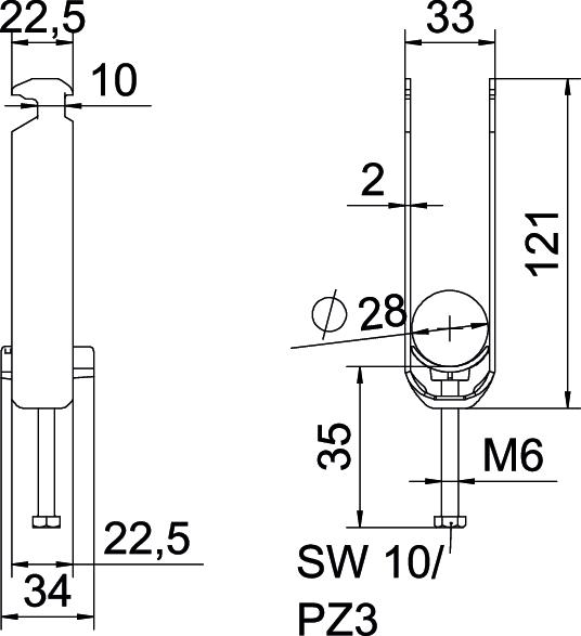 Bügelschelle mit Hammerkopf-Fuß, Kunststoffdruckwanne aus Polypropylen. Zur vertikalen und horizontalen Montage von 3 Einzelkabeln an C-Profilschiene. Für Schlitzweite 16 - 17 mm. Mit 1-gängiger Schraube an Druckwanne, universeller Sechskant-Schraubenkopf SW10, mit Schlitz und Kreuzschlitz. Geeignet für Montage im Innen- und Außenbereich. Mehrere Kabel sollten durch Doppelwannen getrennt werden. Der Einsatz einer Gegenwanne wird empfohlen.
