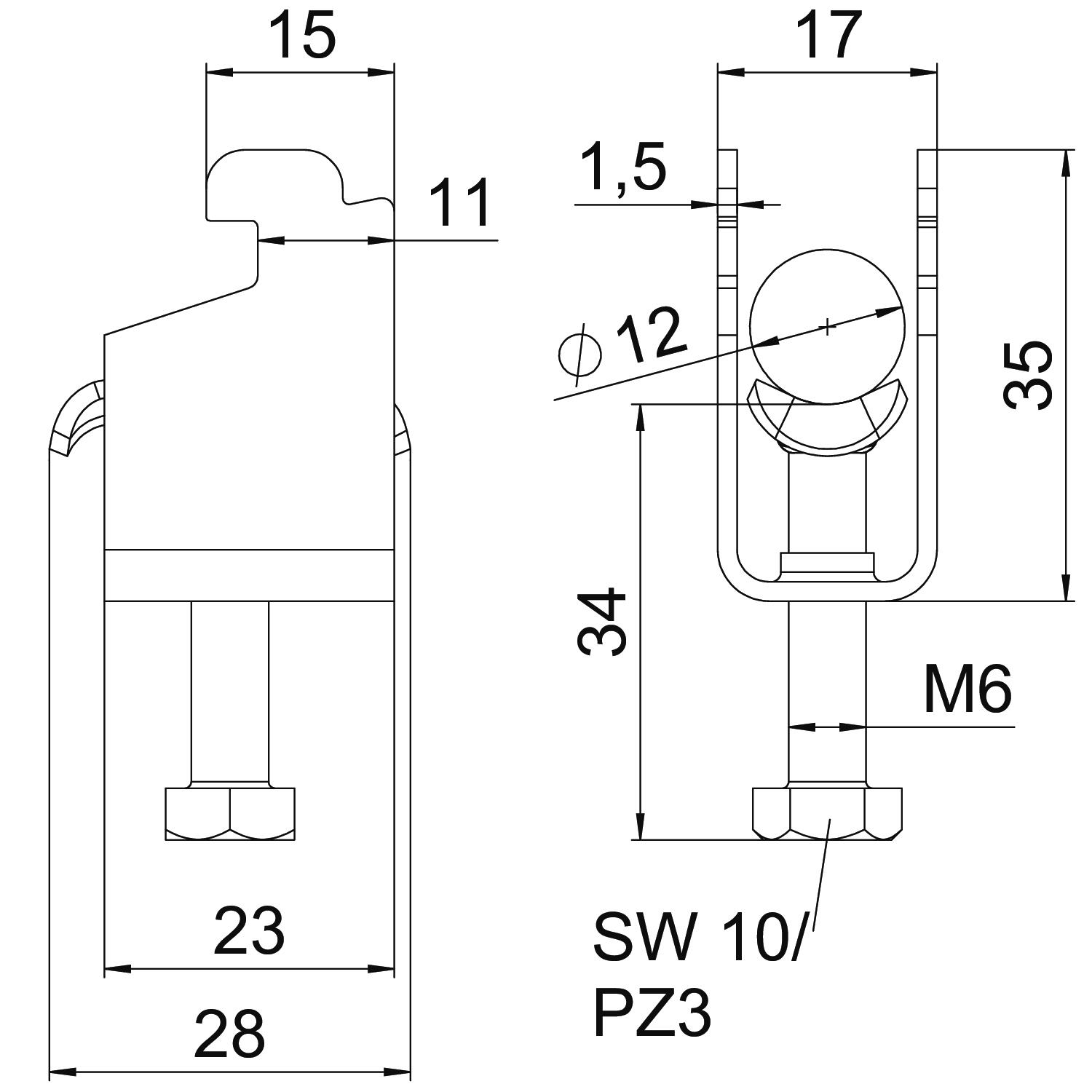 Bügelschelle mit N-Fuß, Metalldruckwanne mit gerundeten Kanten für Kabelschutz. Zur vertikalen und horizontalen Montage von 1 Einzelkabel an C-Profilschiene. Für Schlitzweite 11 - 12 mm. Mit 1-gängiger Schraube an Druckwanne, universeller Sechskant-Schraubenkopf SW10, mit Schlitz und Kreuzschlitz. Geeignet für Montage im Innen-und Außenbereich. Der Einsatz einer Gegenwanne wird empfohlen.