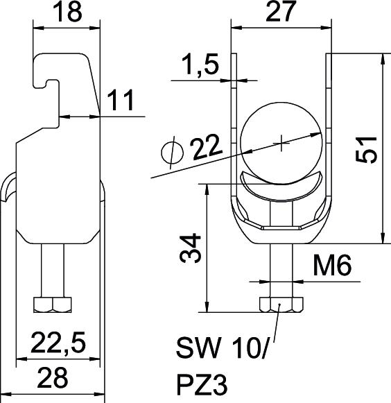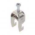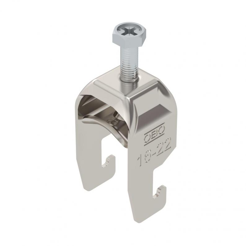 Bügelschelle mit U-Fuß, Metalldruckwanne mit gerundeten Kanten für Kabelschutz. Zur vertikalen und horizontalen Montage von 1 Einzelkabel an C-Profilschiene. Für Schlitzweite 18 - 22 mm. Mit 1-gängiger Schraube an Druckwanne, universeller Sechskant-Schraubenkopf SW10, mit Schlitz und Kreuzschlitz. Geeignet für Montage im Innen-und Außenbereich. Der Einsatz einer Gegenwanne wird empfohlen.