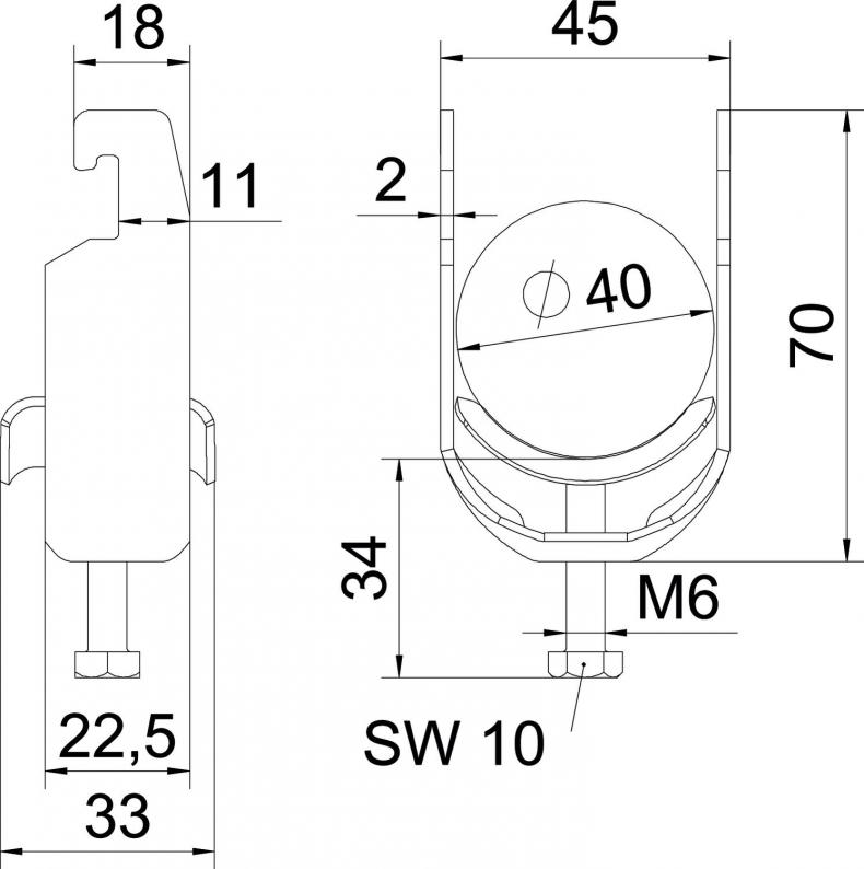 Bügelschelle mit U-Fuß, Metalldruckwanne mit gerundeten Kanten für Kabelschutz. Zur vertikalen und horizontalen Montage von 1 Einzelkabel an C-Profilschiene. Für Schlitzweite 18 - 22 mm. Mit 1-gängiger Schraube an Druckwanne, universeller Sechskant-Schraubenkopf SW10, mit Schlitz und Kreuzschlitz. Geeignet für Montage im Innen-und Außenbereich. Der Einsatz einer Gegenwanne wird empfohlen.