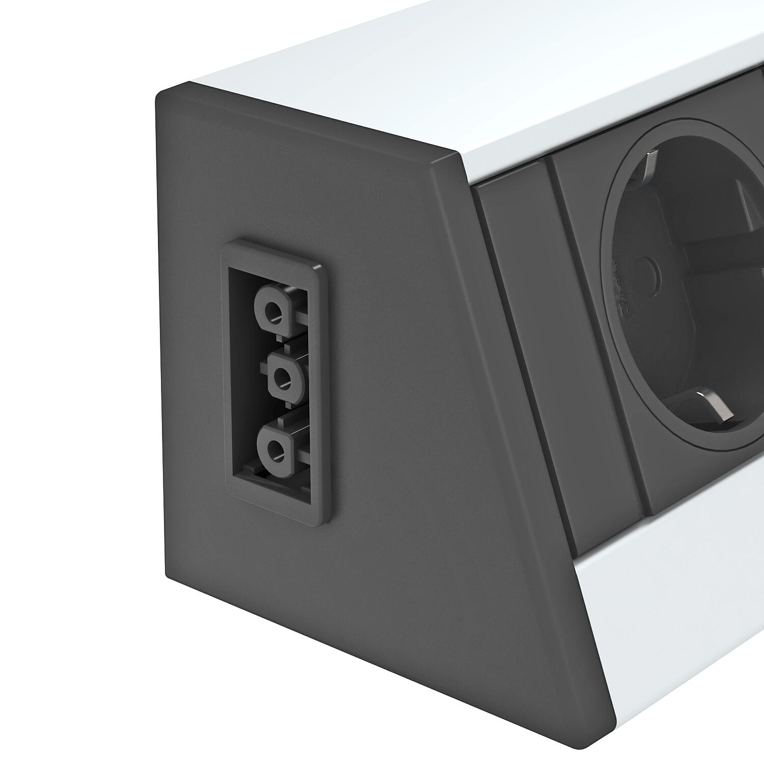 Deskbox mit Anschlusskabel, Kabelauslass von unten aus dem Profil, ohne Befestigungsmaterial, kombinierbar mit den im Zubehör aufgeführten Befestigungslösungen.