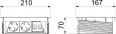 Klappbare Deskbox mit Anschlusskabel, für den festen Einbau in eine Tischplatte, Gehäuse aus gebürstetem Edelstahl mit Bürstenleiste als Leitungsauslass. Die Montage erfolgt über eine Einbauöffnung 195 x 157 mm in der Tischplatte.