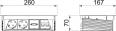 Klappbare Deskbox mit Anschlusskabel, für den festen Einbau in eine Tischplatte, Gehäuse aus gebürstetem Edelstahl mit Bürstenleiste als Leitungsauslass. Die Montage erfolgt über eine Einbauöffnung 245 x 157 mm in der Tischplatte.