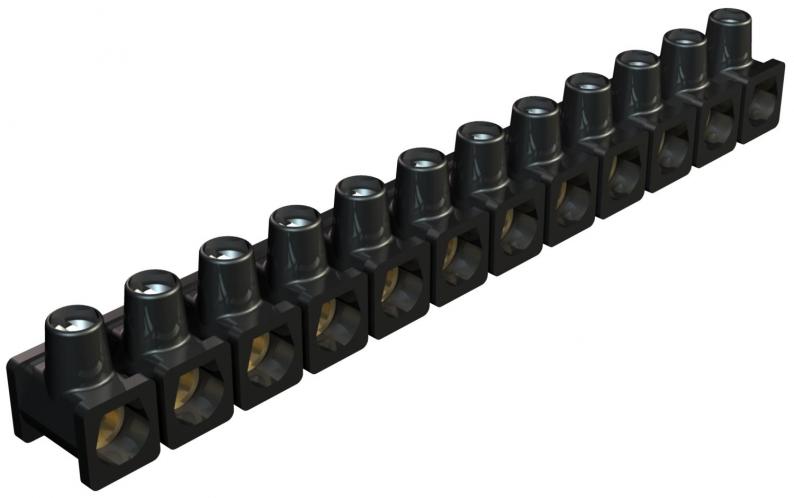 Klemmen Messing, Schrauben Stahl, galvanisch verzinkt und transparent passiviert, 12-polige, in Einzelklemmen abtrennbare Leiste, beidseitig offen.