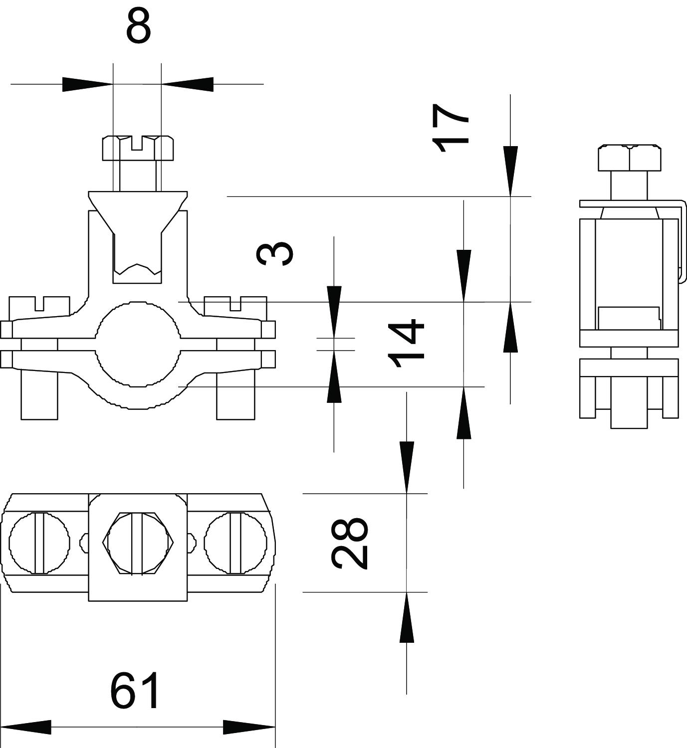 • mit unverlierbarer Druckleiste, 2 Zylinderschrauben M6 x 16 und 1 Sechskantschraube M6 x 16 aus Stahl, galvanisch verzinkt, Schellenoberteil und Unterteil aus Zinkdruckguss