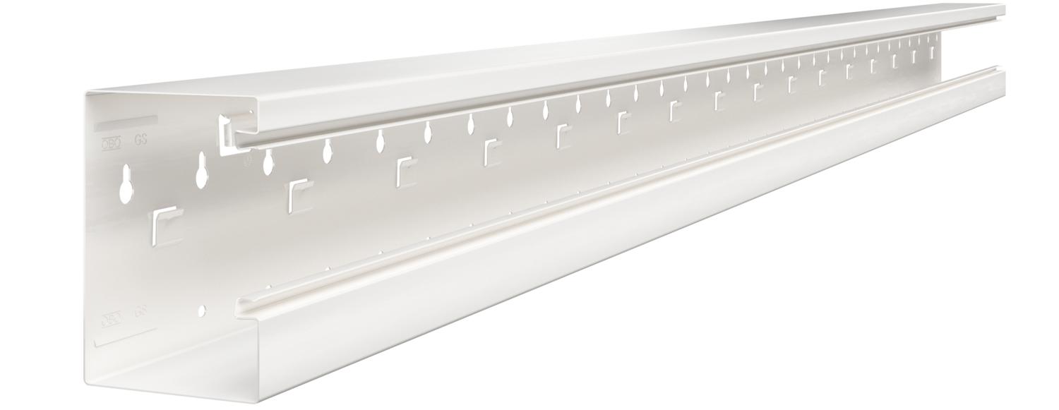 GS Geräteeinbaukanal zur Montage auf der Wand oder an Befestigungskonsolen. Der GS Geräteeinbaukanal verfügt über selbstkontaktierende Rastlaschen zur Aufnahme einer Trennwand aus Stahlblech. Der Potentialausgleich zwischen den Kanalunterteilen erfolgt über die Kupplung. Zwischen Oberteil und Unterteil wird die Schutzmaßnahme und der Potentialausgleich durch die patentierte, selbstkontaktierende Kanalabdeckung gewährleistet. Die Systemöffnung beträgt real 76,5 mm. Das Oberteil muss separat bestellt werden.