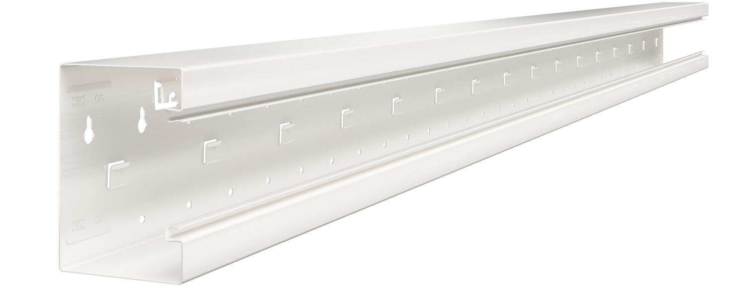 GS Geräteeinbaukanal zur Montage auf der Wand oder an Befestigungskonsolen. Der GS Geräteeinbaukanal verfügt über selbstkontaktierende Rastlaschen zur Aufnahme einer Trennwand aus Stahlblech. Der Potentialausgleich zwischen den Kanalunterteilen erfolgt über die Kupplung. Zwischen Oberteil und Unterteil wird die Schutzmaßnahme und der Potentialausgleich durch die patentierte, selbstkontaktierende Kanalabdeckung gewährleistet. Die Systemöffnung beträgt real 76,5 mm. Das Oberteil muss separat bestellt werden.