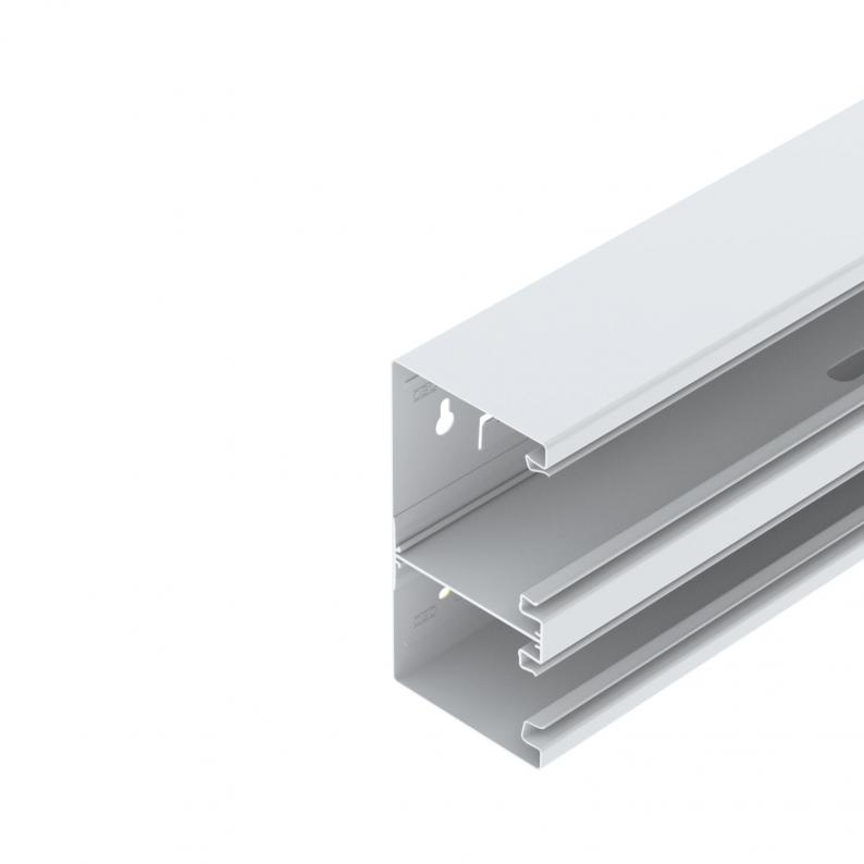 GS Geräteeinbaukanal zur Montage auf der Wand oder an Befestigungskonsolen. Der GS Geräteeinbaukanal verfügt über selbstkontaktierende Rastlaschen zur Aufnahme einer Trennwand aus Stahlblech. Der Potentialausgleich zwischen den Kanalunterteilen erfolgt über die Kupplung. Zwischen Oberteil und Unterteil wird die Schutzmaßnahme und der Potentialausgleich durch die patentierte, selbstkontaktierende Kanalabdeckung gewährleistet. Die Systemöffnung für den Geräteeinbau beträgt real 76,5 mm. Die zweite Kanalspur mit einer Systemöffnung von 45 mm dient zur Leitungsführung. Ein Einbau von Modul45 Schalt- und Steckgeräten ist hier nicht möglich. Das Oberteil muss separat bestellt werden.