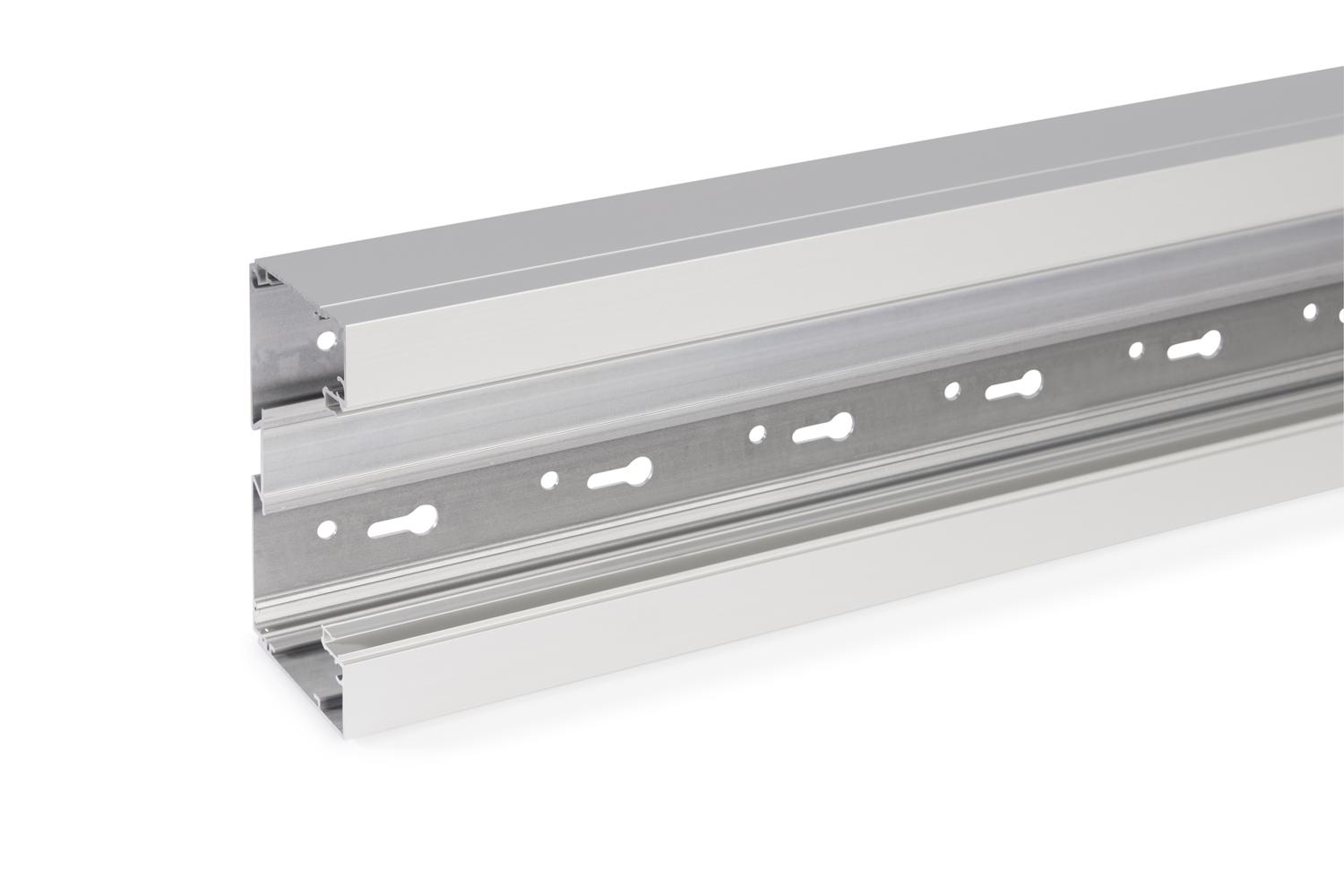 Geräteeinbaukanal mit Bodenlochung zur direkten Wandmontage oder an Konsolen geeignet. Andere RAL-Farben können auf Anfrage realisiert werden. Die Sichtflächen der Geräteeinbaukanäle sind foliiert.
