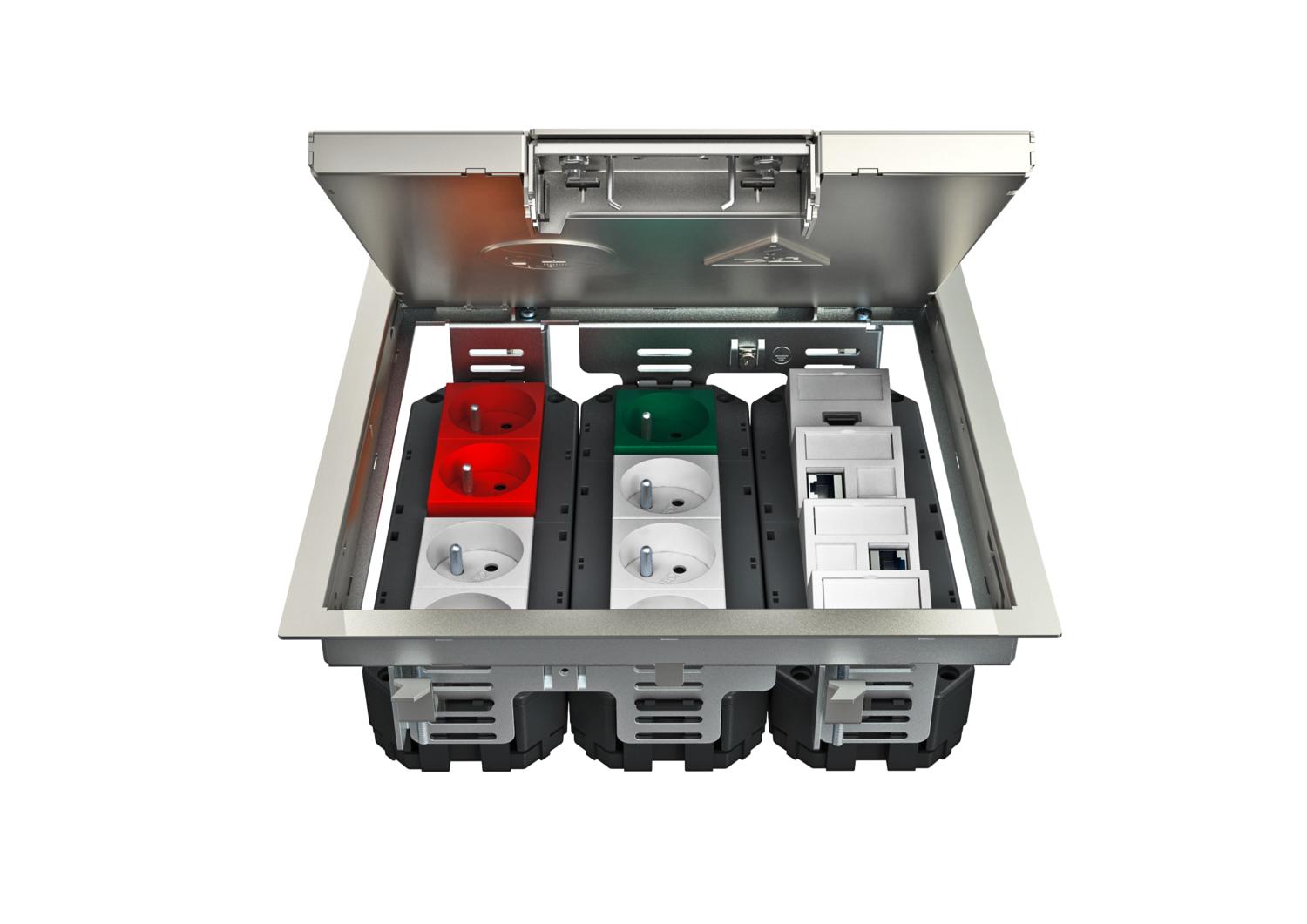 Geräteeinsatz mit Griffbügel für bis zu 12 Modul 45-Einzelgeräte in 3 Universalträger UT4, Einsatz in Kanalsystemen und Systemböden im Innenbereich.