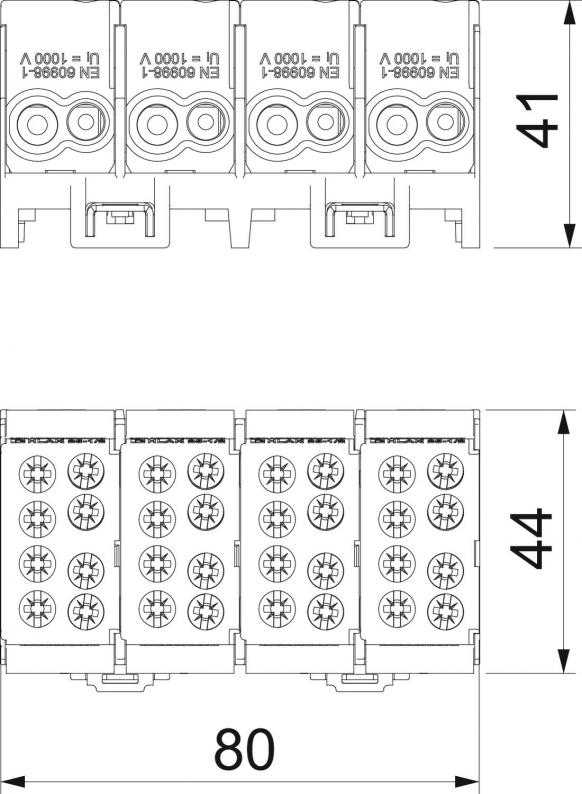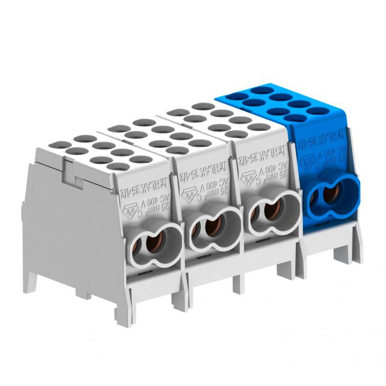 4-polige Hauptleitungsabzweigklemme mit 2 x 16 mm² + 2 x 25 mm² Leiteranschlussquerschnitten pro Pol. Mit 2 Schrauben pro Klemmstelle für einen sicheren Kontaktdruck. Hochfeste Schnellbefestigung aus verzinktem Stahlblech zur einfachen Montage auf Tragschienen.