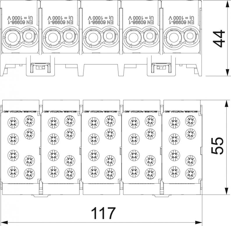 5-polige Hauptleitungsabzweigklemme mit 2 x 35 mm² + 2 x 25 mm² Leiteranschlussquerschnitten pro Pol. Mit 2 Schrauben pro Klemmstelle für einen sicheren Kontaktdruck. Hochfeste Schnellbefestigung aus verzinktem Stahlblech zur einfachen Montage auf Tragschienen.
