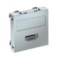 Multimediaträger mit einer HDMI Anschlussbuchse, Kabelauslass gerade, mit Beschriftungsfeld, HDMI Buchse mit Schraubanschluss. Trägerplatte mit Rastbefestigung, geeignet für den waagerechten und senkrechten Einbau in die Systemumgebung.