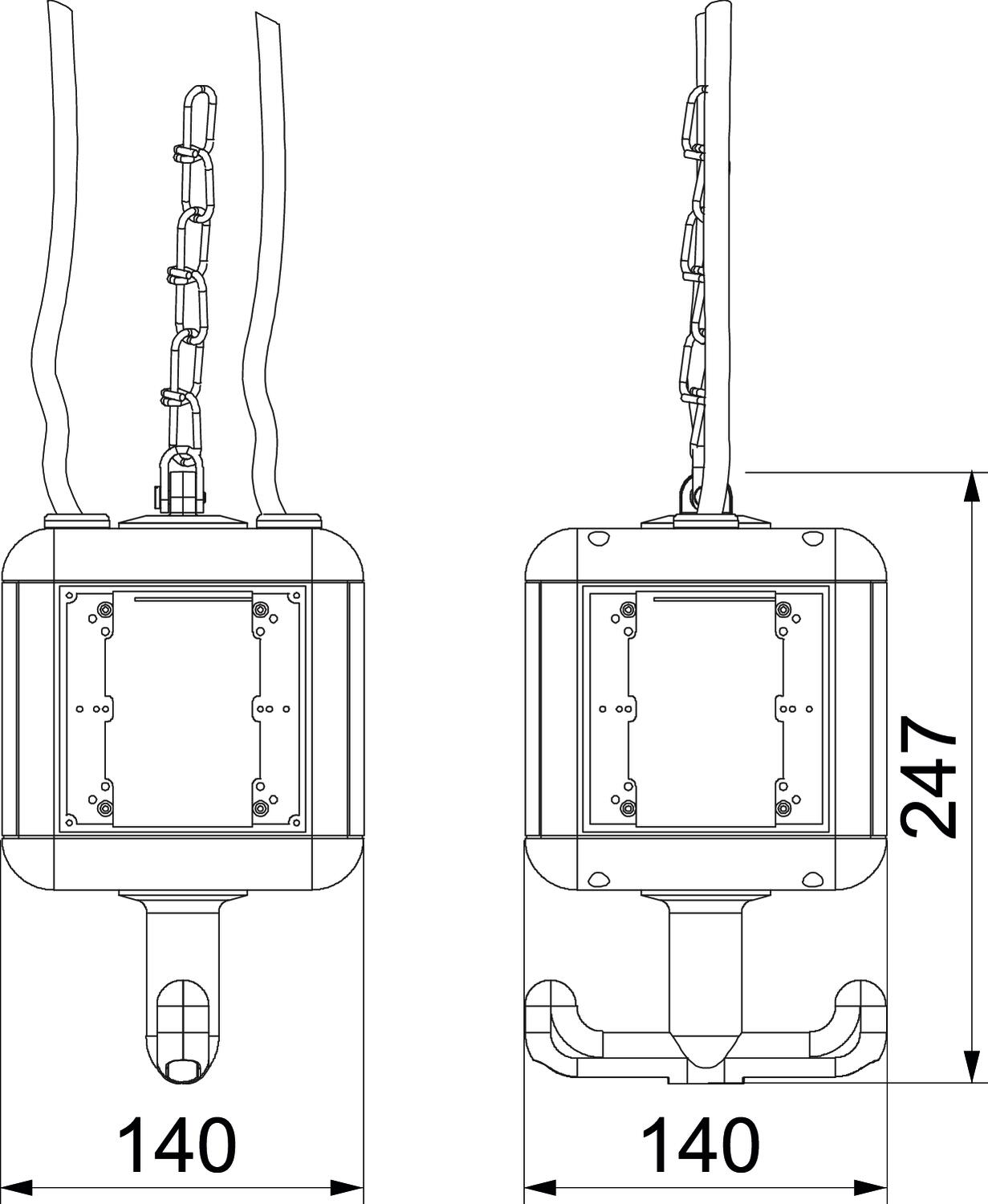 Leergehäuse mit Aufhängeöse und Griffhaken, zum Einbau von 4 elektrischen Betriebsmitteln, mit beigelegter Trennwand. Ohne Abdeckplatten.