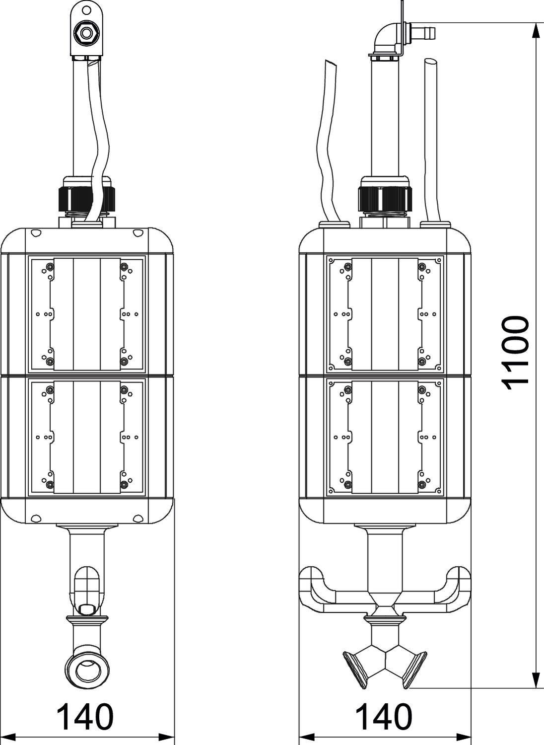 Leergehäuse mit 1 m Rohr 1/2” und Anschluss für Druckluftschlauch 13 x 3,5 mm und 2-Wege-Verteiler 1/2”. Mit Aufhängeöse und Griffhaken, zum Einbau von elektrischen Betriebsmitteln, mit beigelegter Trennwand. Ohne Abdeckplatten.