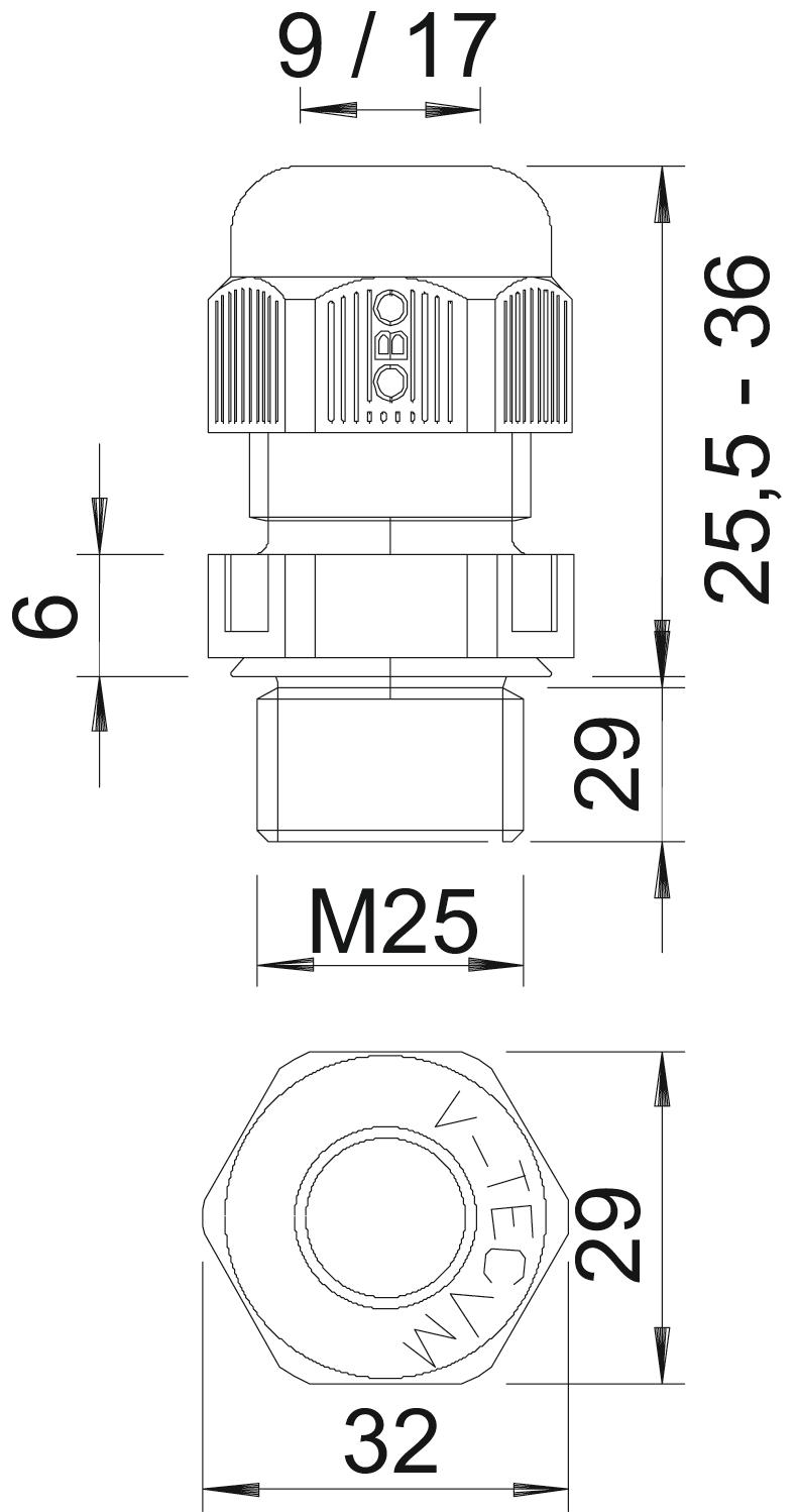 Robuste Kabelverschraubung mit metrischem Anschlussgewinde nach IEC 423 in Hutmutterbauart für hohe Dichtigkeitsansprüche. Zugentlastung, Verdrehschutz und Dichtigkeit über den gesamten Spannbereich. Für dickere Gehäusewandstärken in Verbindung mit Gegenmutter. Dichtring aus Neopren. Klemmeinsatz aus Polyamid. Mit vormontiertem Dichtring am Anschlussgewinde, VDE-geprüft nach DIN EN 50262, Schutzart IP68 bei 5 bar/1 h.
