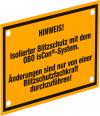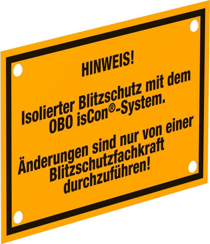 Aufdruck: "HINWEIS! Isolierter Blitzschutz mit OBO isCon®-System. Änderungen sind nur von einer Blitzschutzfachkraft durchzuführen"
