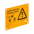 Aufdruck: "HINWEIS! Isolierter Blitzschutz mit OBO isCon®-System. Änderungen sind nur von einer Blitzschutzfachkraft durchzuführen"