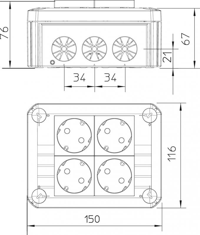 Kabelabzweigkasten zum Verbinden von Kabeln und Leitungen im Innenbereich und geschützten Außenbereichen. Rechteckige Form mit Ausschlageinführungen an den Seiten und Ausschlageinführungen im Boden. Geeignet für die Wand-/ Deckenmontage und die Montage auf Montageblechen. Mit der Möglichkeit zur Innenbefestigung und Außenbefestigung bei der Montage über die Eckdome. Deckel mit Schnellverschluss, plombierbar mit Verliersicherung und 4 Modul45-Steckdosen. Hergestellt aus halogenfreien und UV-resistenten Materialien.