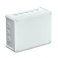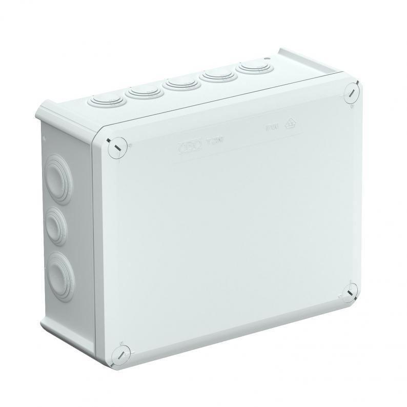 Kabelabzweigkasten zum Verbinden von Kabeln und Leitungen im Innenbereich und geschützten Außenbereichen. Rechteckige Form mit Einsteckdichtungen an den Seiten und Ausschlageinführungen im Boden. Geeignet für die Wand-/ Deckenmontage, die Montage auf Montageblechen und Gewinde im Boden. Mit der Möglichkeit zur Innenbefestigung und Montage über die Eckdome. Deckel mit Schnellverschluss, plombierbar. Hergestellt aus halogenfreien und UV-resistenten Materialien. Kabelabzweigkasten gemäß DIN EN 60670. Flammwidrig nach DIN EN 60695-2-11, Prüftemperatur 650°C. Schlagfestigkeit IK05 gemäß DIN EN 50102.