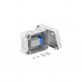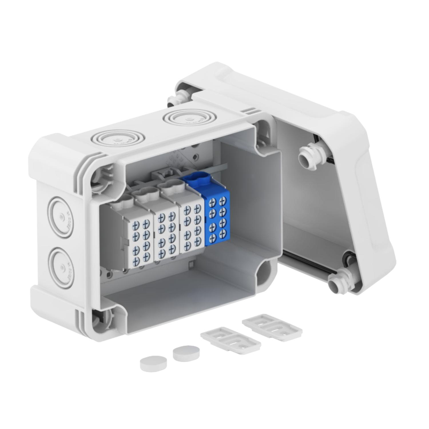 Kabelabzweigkasten mit Klemme zum Verbinden von Kabeln und Leitungen im Innen- und Außenbereich. Rechteckige Form mit Ausschlageinführungen. Geeignet für die Wand-/ Deckenmontage mit der Möglichkeit zur Außenbefestigung, Innenbefestigung oder Montage über die Eckdome. Besonders schlagfest mit IK09. Deckel mit Schnellverschluss, plombierbar. Hergestellt aus halogenfreien und UV-resistenten Materialien.
