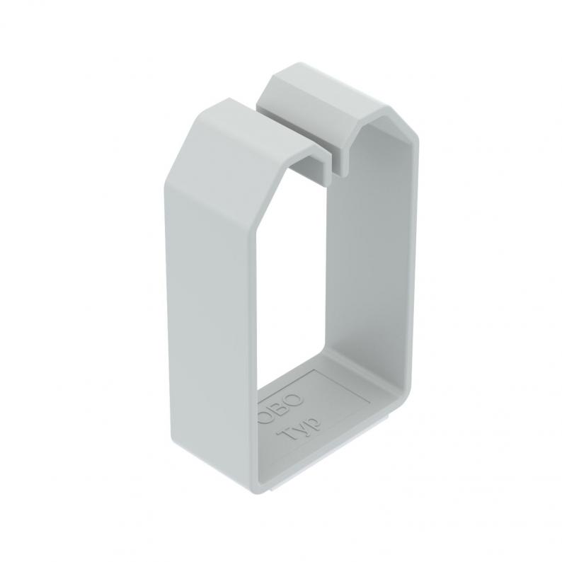 Kabelhalteklammer für LKV-Verdrahtungskanäle. Die Kabelhalteklammer umfasst alle im Kanal installierten Leitungen und verhindert das Herausfallen beim Abnehmen der Oberteile. Mit Klebeband an der Unterseite zur Montage.