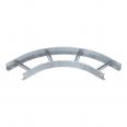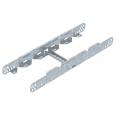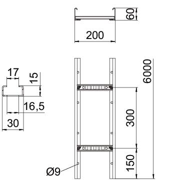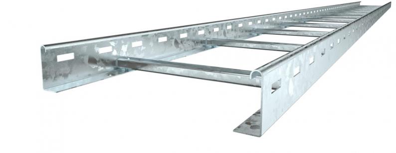 Kabelleiter in Seitenhöhe 60 mm mit eingeschweißten, nach oben offenen C30 Profilsprossen. Eingerollter Seitenholm zur Verstärkung und als Kantenschutz. Die Befestigung auf dem Ausleger erfolgt mit Klemmstücken Typ LKS 40. Das Schlitzmaß der Sprosse beträgt 16,5 mm, die passende Bügelschelle ist der Typ 2056.