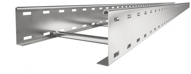Kabelleiter mit gelochtem Seitenholm in der Seitenhöhe 110 mm mit eingenieteten, nach oben offenen C-Profil-Sprossen.