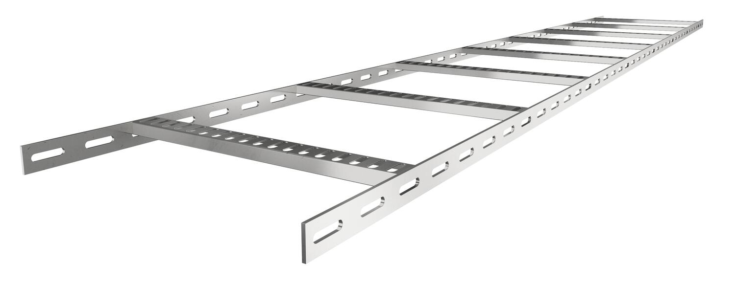 Schiffsbau-Kabelleiter mit gelochtem Seitenholm in der Seitenhöhe 25 mm, mit eingeschweißten, nach unten offenen und gelochten Trapezsprossen. Belastung geprüft nach IEC in Kombination mit Verbinder Typ SLV.