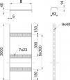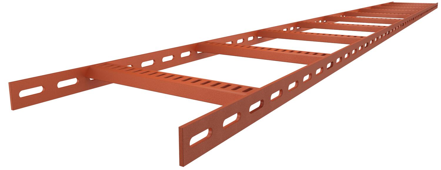 Schiffsbau-Kabelleiter mit gelochtem Seitenholm in der Seitenhöhe 40 mm mit eingeschweißten, nach unten offenen, gelochten Trapezsprossen. Belastung geprüft nach IEC in Kombination mit Verbinder Typ SLV. Schweißgrundierung Typ SIGMA-WELD 199.