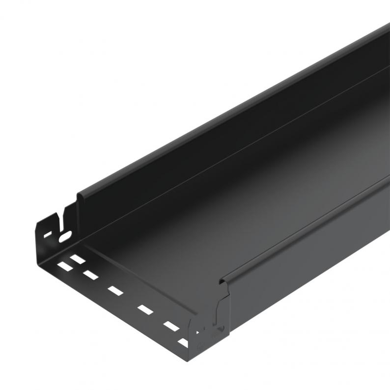 Ungelochte Kabelrinne mit integriertem Schnellbefestigungssystem. Schwarz beschichtet.