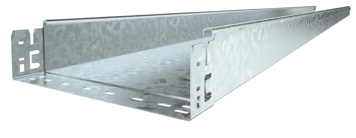 Ungelochte Kabelrinne mit integriertem Schnellbefestigungssystem. Die Nutzlänge der Kabelrinne beträgt 3.000 mm.