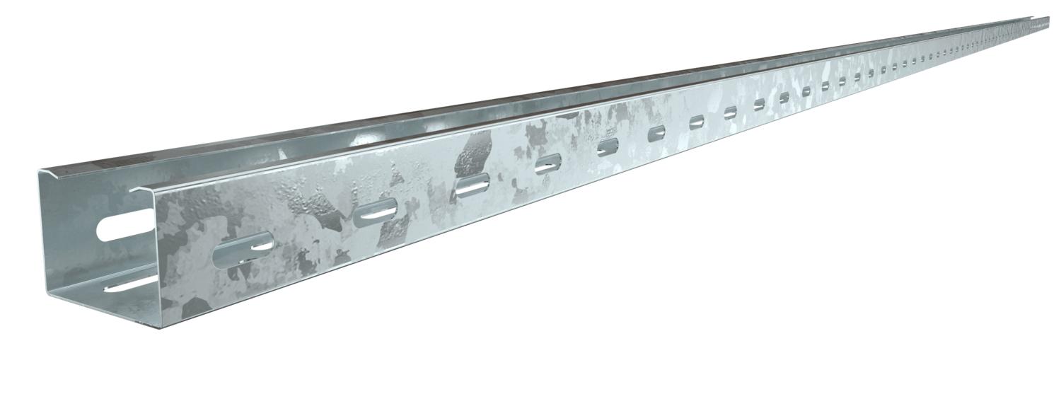 Kabelrinne mit durchgängiger Boden- und Seitenperforation sowie Mittellochung (Ø11 mm) im Boden für zusätzliche Befestigungen.